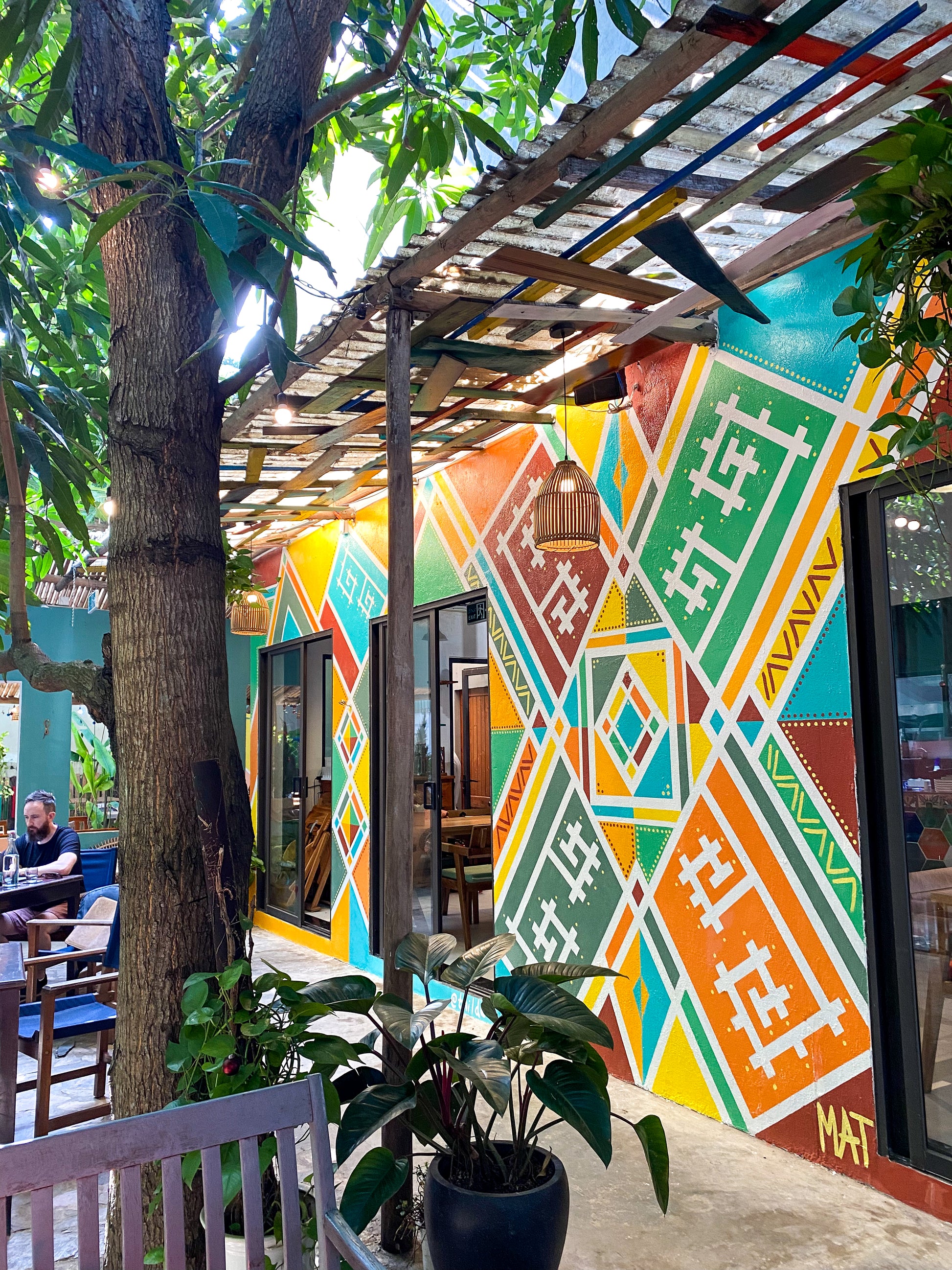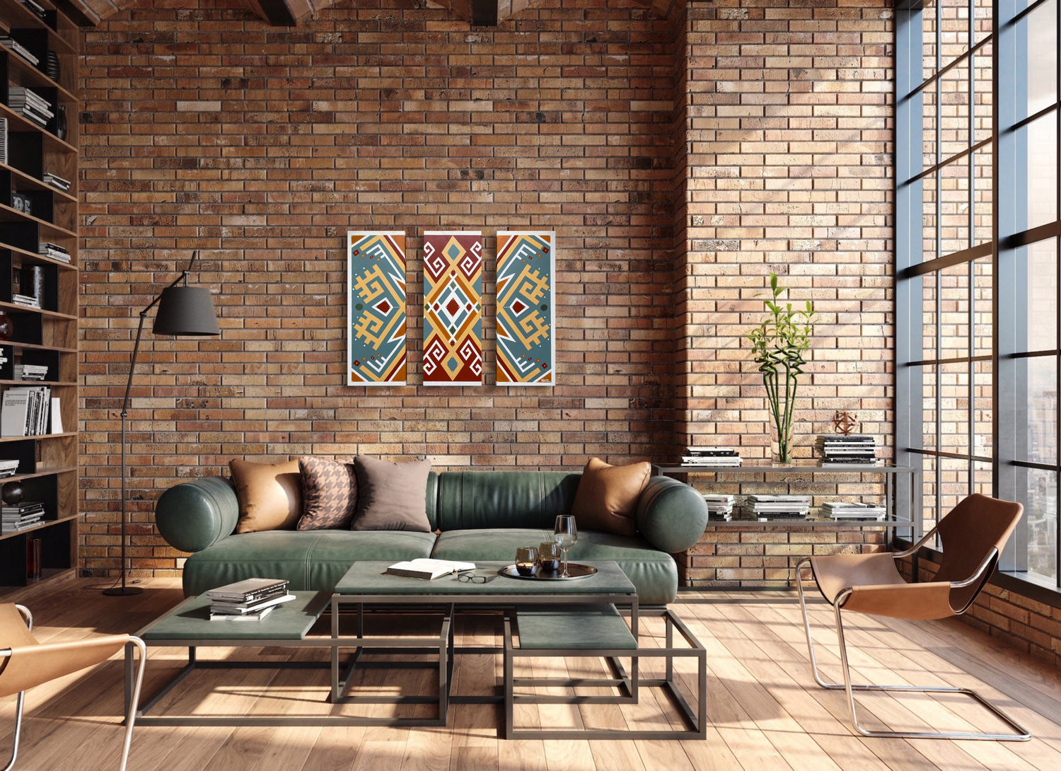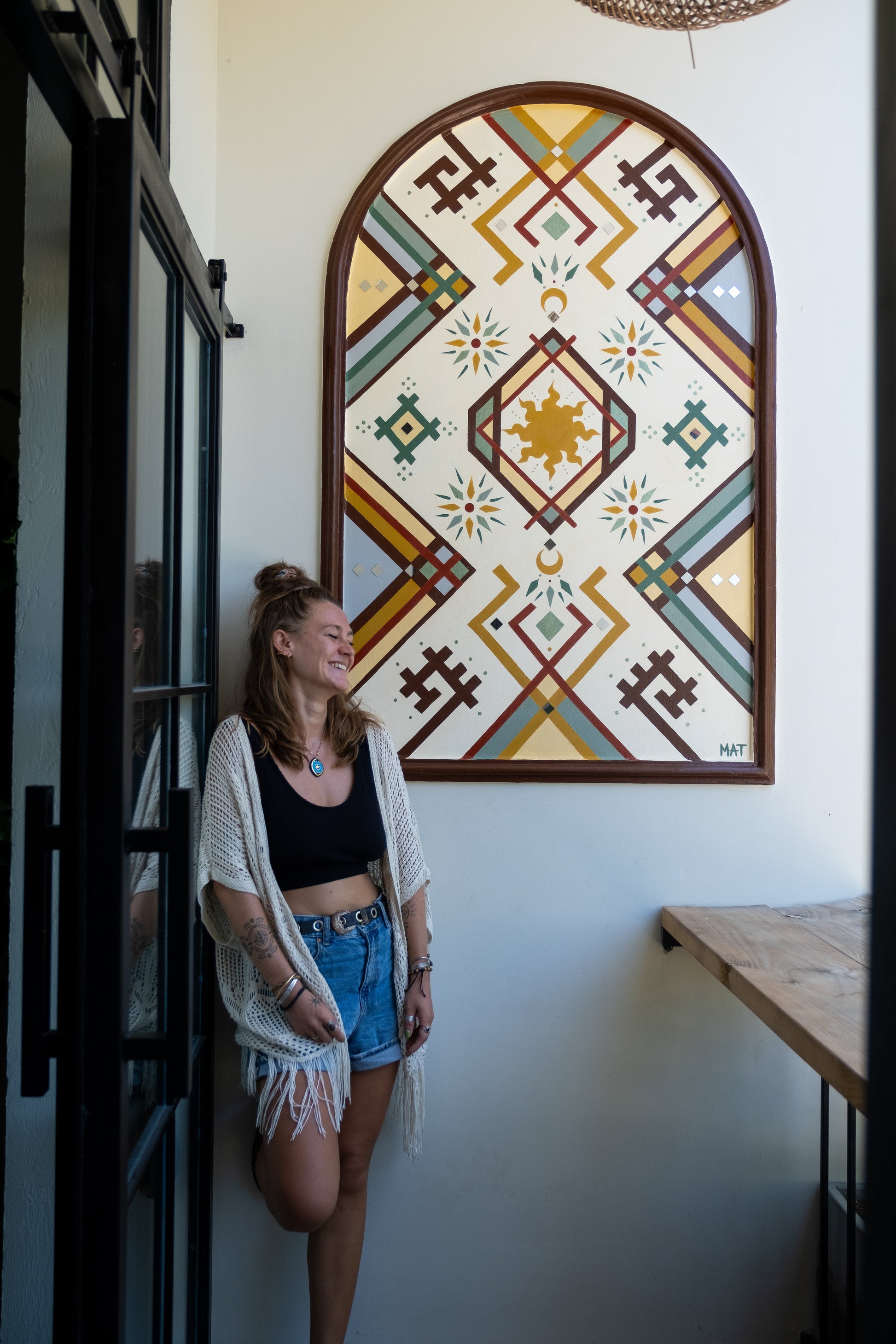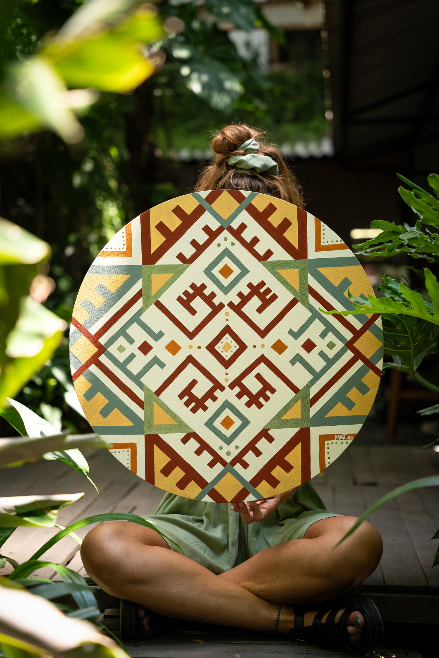 Her paintings weave geometric forms, earthy tones, and ethnic patterns, echoing the textures and cultures that surround her. More than visual pieces, they invite you to pause, feel, and reconnect with what grounds you.